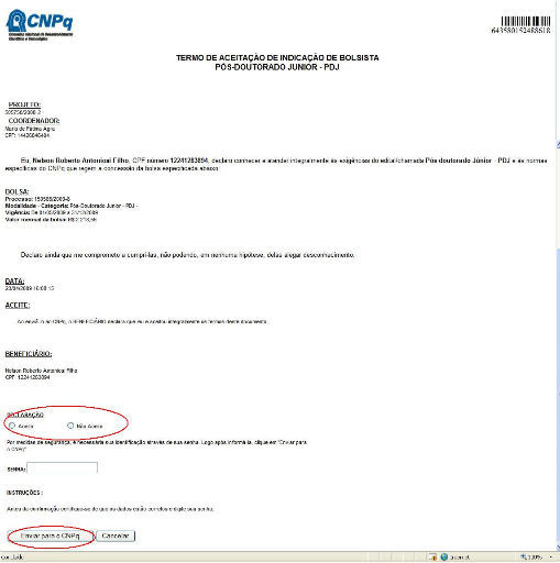- Enviado os dados para o CNPq, a tela com o pdf é apresentada;